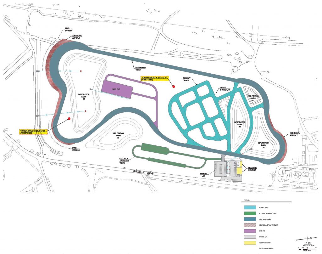 The $15,500,000 project will consist of, but not be limited to, a vehicle driving/training track, skid pan, new modular office/locker rooms, collision avoidance and pursuit track, track appurtenances, paved parking area, bioswales, landscaping, and relocation of Southern California Edison and various facility power poles. The overall site area for the proposed EVOC is approximately 44.5 acres.