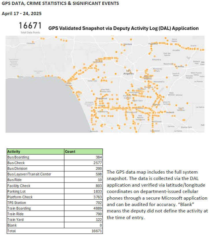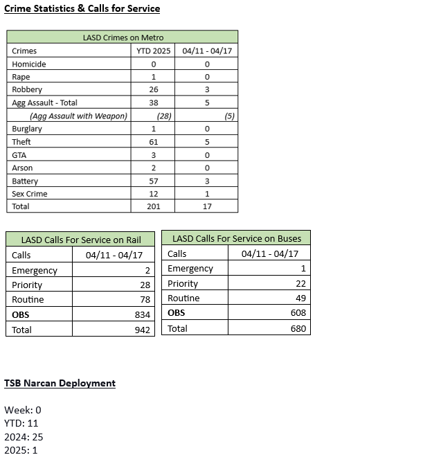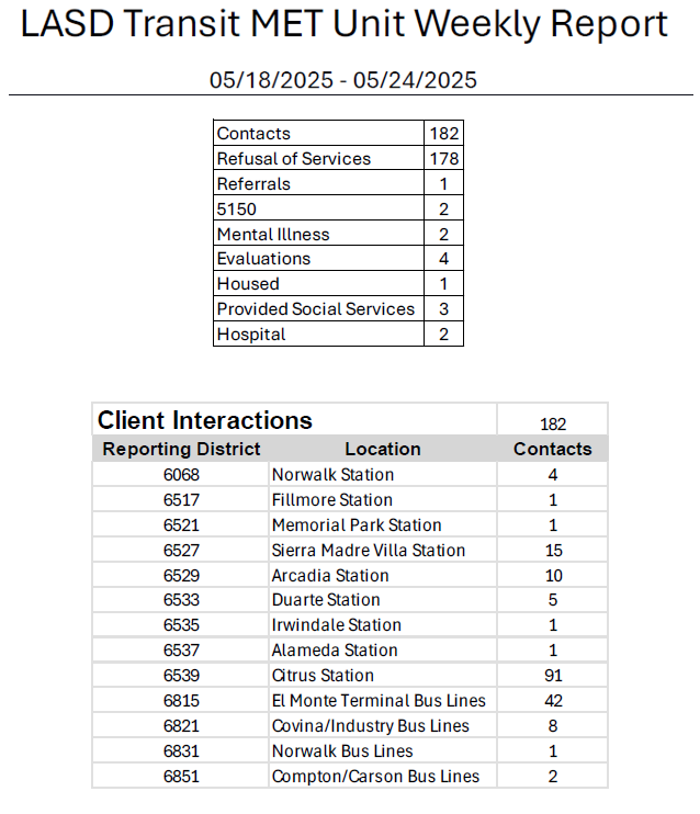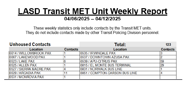 Transit Services Bureau (TSB) Deputies responded to the El Monte Bus Terminal regarding an assault with a deadly weapon against a Metro Security Officer, call for service. Upon the Deputy’s arrival, they located a male adult (suspect) walking in the riverbed adjacent to the bus terminal, and a short foot pursuit was initiated. Deputies contacted the Metro Security officer, who stated the suspect had swung a metal chain at the Metro security officer, nearly missing him. The suspect was positively identified and arrested for the indicated charge.
