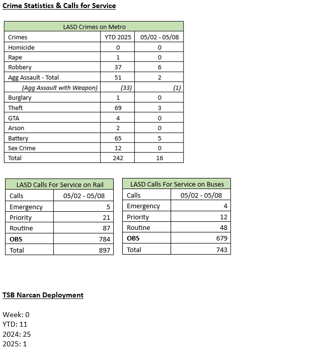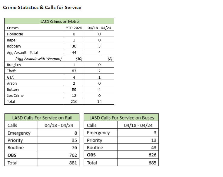 Transit Services Bureau (TSB) Deputies responded to the Metro division yard regarding a see-the-man report call for service. Upon arrival, Deputies contacted the Metro Supervisor, who stated that an unknown suspect entered the location and stole 100 feet of copper wire. The suspects cut the copper wire from the right-of-way track area and fled the location. The damage and repairs were estimated at $3,500. The suspect is still outstanding.
