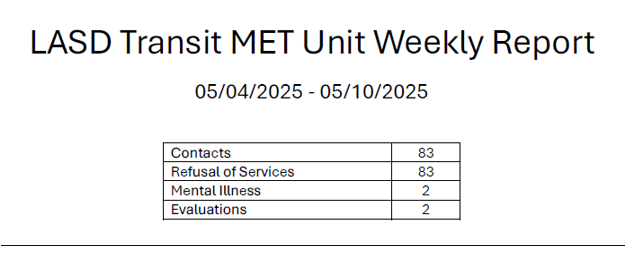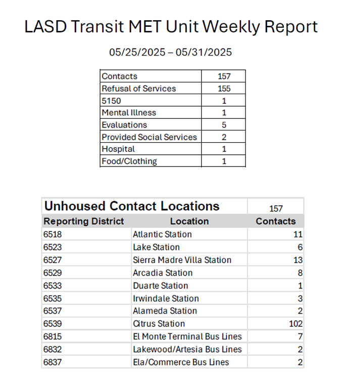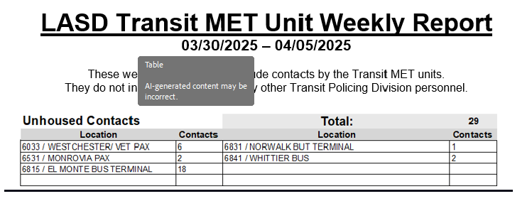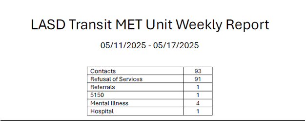 Transit Services Bureau (TSB) Deputies responded to the intersection of Alondra Blvd and Willowbrook Ave in the city of Compton regarding a train vs. vehicle call for service. Upon arrival, Deputies spoke with the train operator, who reported that he had collided with a vehicle that was stopped on the tracks. When the operator looked back, the vehicle had already left the location. The operator, nor the passengers, reported any injuries or complaints of pain, and all passengers declined medical treatment. Compton Sheriff’s Station responded and took over the traffic investigation. The train sustained minor scrape damage to its side. A search for the vehicle involved in the incident was conducted but was not located.