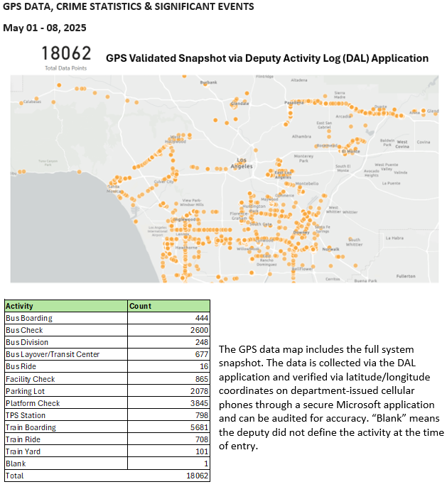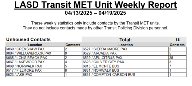 Transit Services Bureau (TSB) Deputies responded to the Compton Metro Passenger Station regarding an assault with a deadly weapon call for service. Upon arrival, Deputies contacted an adult female (witness) who was waiting on the platform and observed an adult male (suspect) slam an adult female’s (victim) head against a concrete pillar multiple times on the platform. The deputies located and detained the suspect pending an assault investigation. The witness positively identified the suspect as the person who assaulted the victim. A search for the victim was conducted, but she was not located. Based on the witnesses’ statements and a review of CCTV of the incident, the suspect was arrested for the assault.