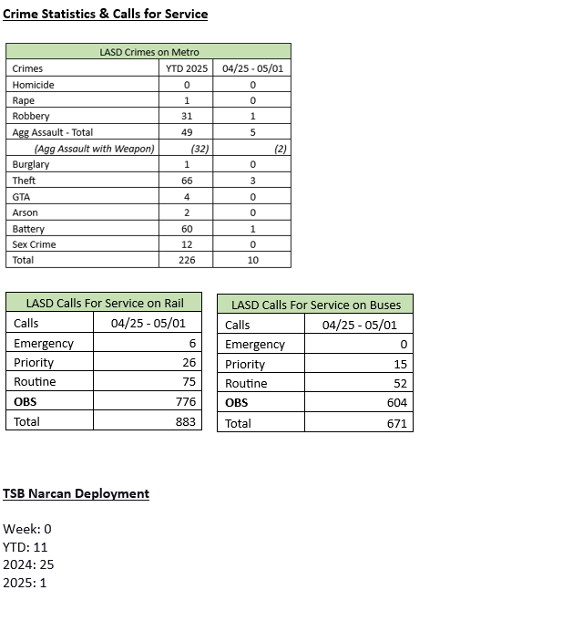 Transit Services Bureau (TSB) Deputies responded to Irwindale Metro Passenger Station regarding an adult male who was unresponsive on the platform call for service. Upon arrival, Deputies made contact with Los Angeles County Fire, who was working on an unresponsive male on the platform. Personnel from the fire department administered successful Narcan. The male regained consciousness and was transported to a local hospital for further evaluation.