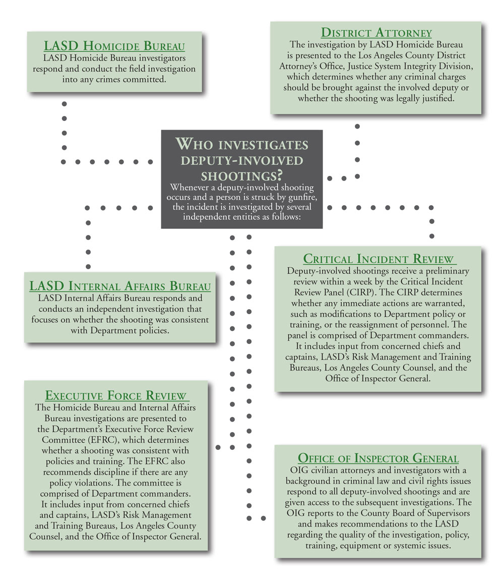 The Sheriff’s Department conducts very thorough and clearly-defined investigations into shootings and uses of force. The Internal Affairs Bureau Force/Shooting Response Team conducts an administrative review of all deputy-involved shootings, when no one is struck by gunfire. Homicide Bureau is responsible for the criminal investigation of all deputy-involved shootings when a person is struck by gunfire.